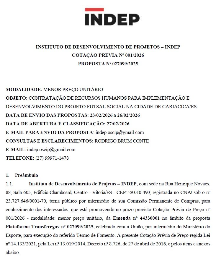Edital nº 001_2026 – RH – 027099_2025INSTITUTO DE DESENVOLVIMENTO DE PROJETOS – INDEP COTAÇÃO PRÉVIA Nº 001/2026 PROPOSTA Nº 027099/2025 MODALIDADE: …2026/02/25Edital nº 001_2026 - RH - 027099_2025