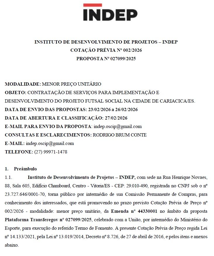 Edital nº 002_2026 – Serviços – 027099_2025INSTITUTO DE DESENVOLVIMENTO DE PROJETOS – INDEP COTAÇÃO PRÉVIA Nº 002/2026 PROPOSTA Nº 027099/2025 MODALIDADE: …2026/02/25Edital nº 002_2026 - Serviços - 027099_2025