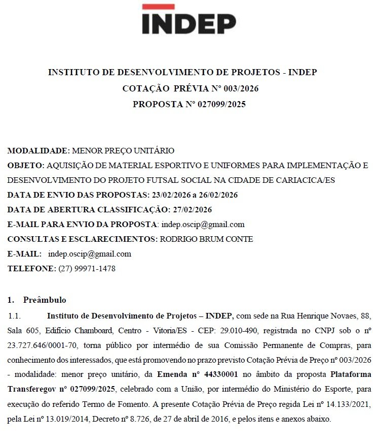Edital nº 003_2026 – Material Esportivo e Uniformes – 027099_2025INSTITUTO DE DESENVOLVIMENTO DE PROJETOS – INDEP COTAÇÃO PRÉVIA Nº 003/2026 PROPOSTA Nº 027099/2025 MODALIDADE: …2026/02/25Edital nº 003_2026 - Material Esportivo e Uniformes - 027099_2025