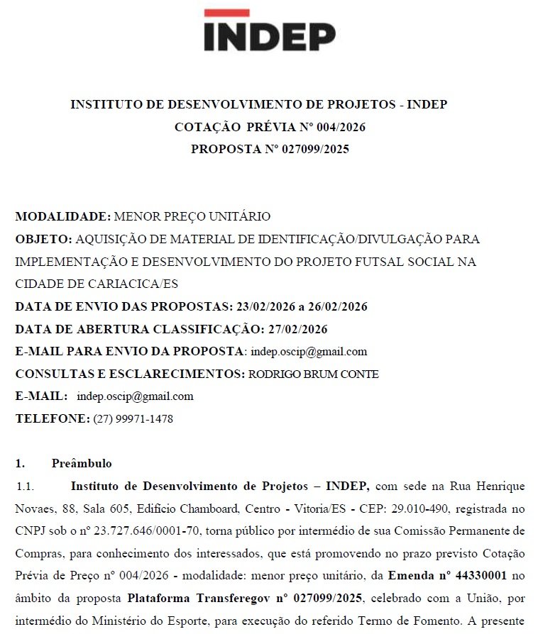 Edital nº 004_2026 – Material de Identificação e Divulgação – 027099_2025INSTITUTO DE DESENVOLVIMENTO DE PROJETOS – INDEP COTAÇÃO PRÉVIA Nº 004/2026 PROPOSTA Nº 027099/2025 MODALIDADE: …2026/02/25Edital nº 004_2026 - Material de Identificação e Divulgação - 027099_2025